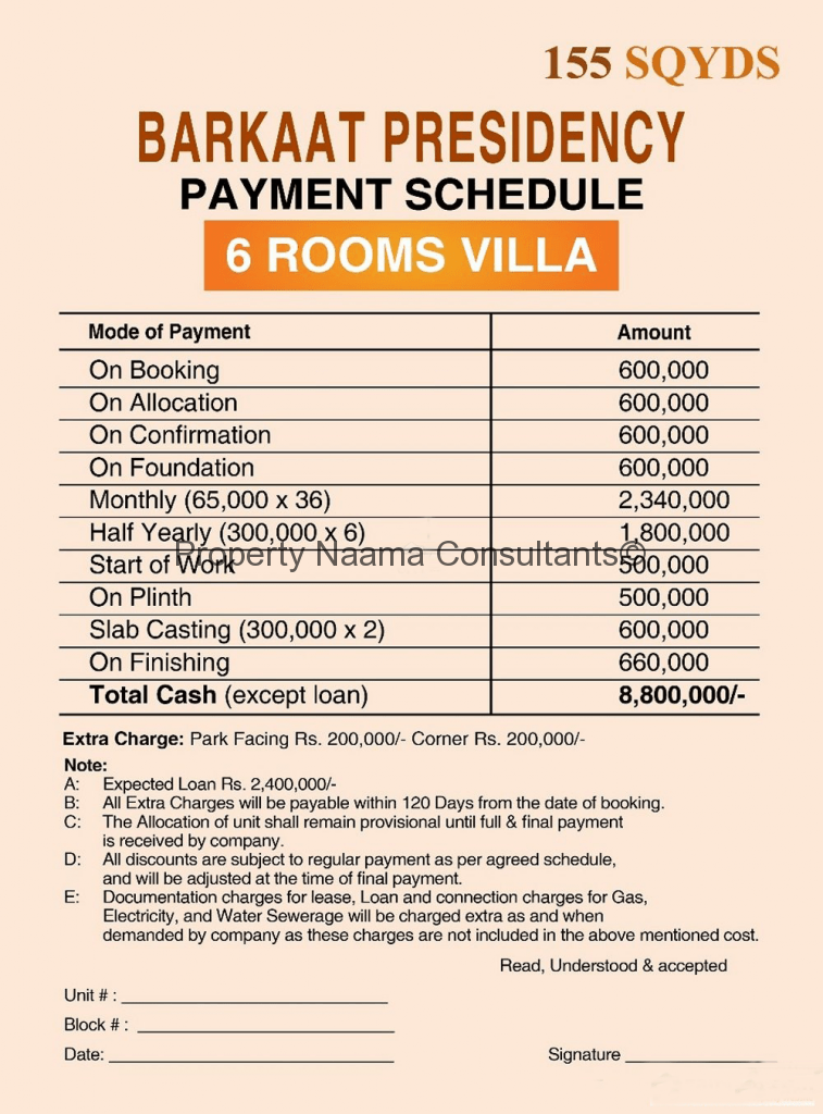 So, all the latest prices and the complete payment plan details of Barkaat Presidency Villas are: