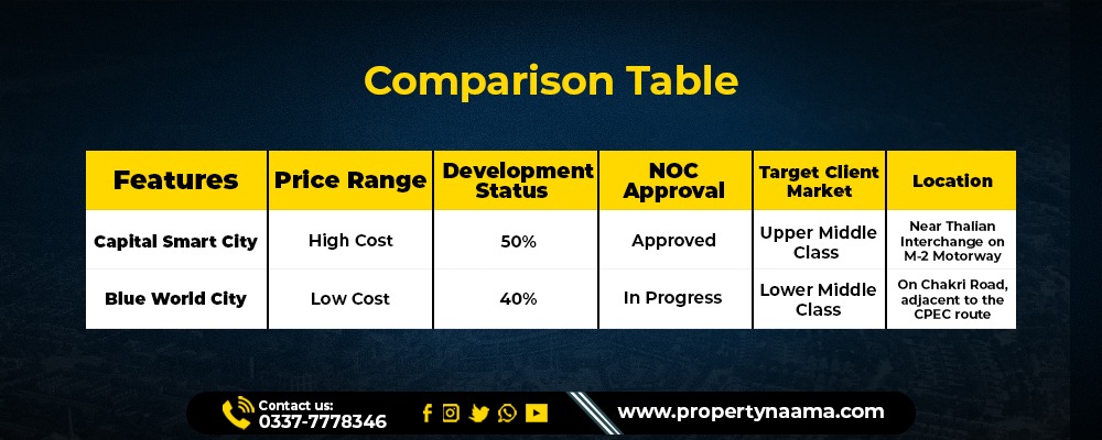 Blue World City vs Capital Smart City Islamabad are well-known projects. They have modern facilities and amenities. The Capital Smart City is a high-cost project suited for the upper-middle class of society.