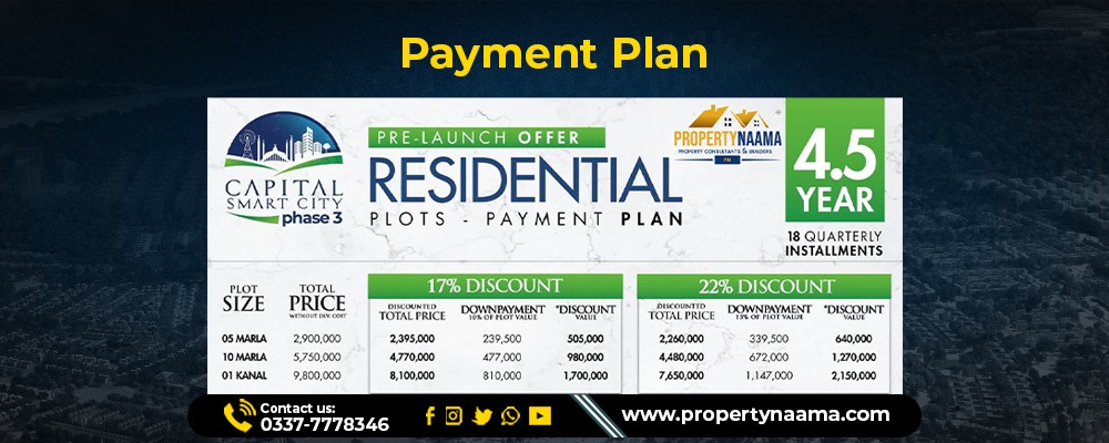 Book your plot by paying a down payment and then paying 18 quarterly installments. According to the announced payment plan, you can avail of a discount of 17% and 22% for residential plots. Here is the complete breakdown of the payment plan:
