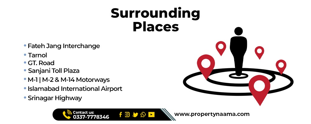 Additionally, it is adjacent to the M-1 Motorway Fateh Jhang Interchange, close to the CPEC route and the Islamabad International Airport. Here are the accessibility routes and points of this location: