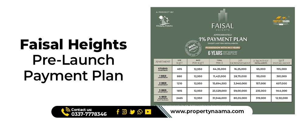 You can book the studio, 01, 02, 03, and 04-bed apartments in the Faisal Heights, Islamabad, under the pre-launch rates. Here is a detailed payment plan for this project.