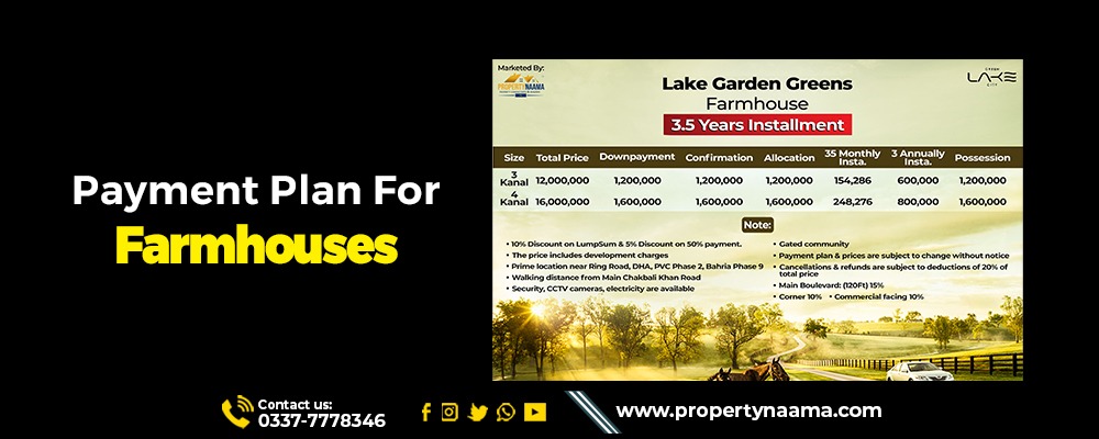 These 3 and 4 Kanal farmhouses plots are available on a 3.5-year easy installment plan. I have shared here a summary of its payment plan: