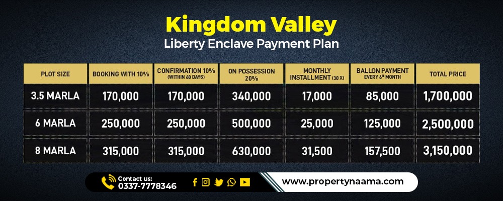 You can book multiple sizes of residential plots in Kingdom Valley Liberty Enclave through a 03 years affordable payment plan. Below is the table summary of this payment plan: