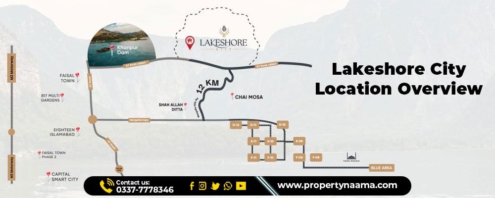 The location of Lakeshore City Khanpur is near the Khanpur Dam in Khanpur City, Khyber Pakhtunkhwa (KPK). It is a 15-minute distance from the D-12 sector of Capital City, Islamabad. Therefore, it is a strategic location to access nearby famous destinations, such as Faisal Town, Rajdani, and Multi Garden B-17.